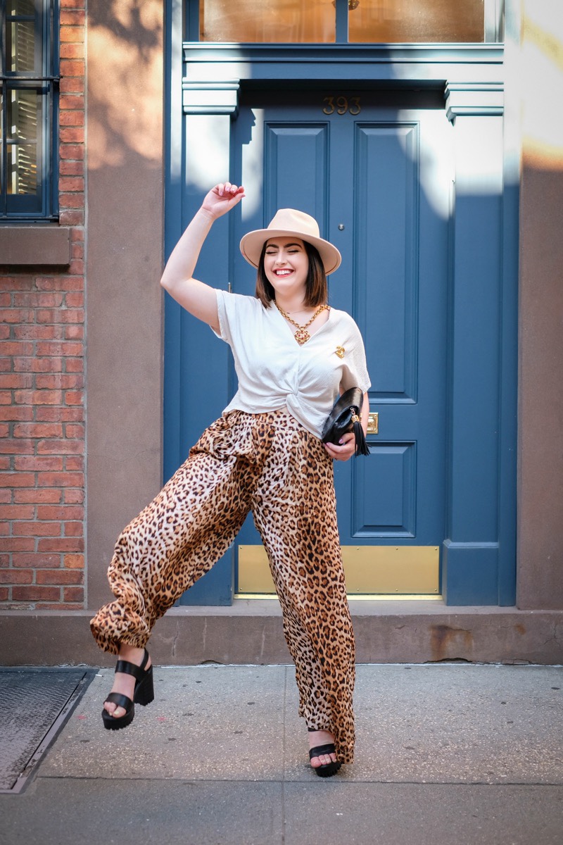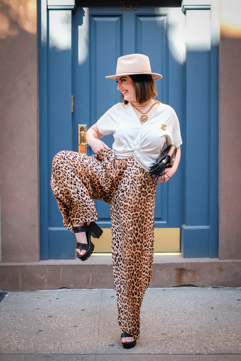 An alternative to another day of wearing uncomfortable shorts, wide leg pants are a breezy, trendy, and comfy outfit option for summer days. ESPECIALLY in light weight materials like linen and chiffon, wide leg pants make for a (literally) cool statement bottom. Typically in bold prints and colors, wide leg pants add a bit of playful sophistication to a basic tank top or T-shirt (even though they feel like wearing pajama bottoms!). Wide leg pants like this leopard print pair from Urban Outfitters are perfect for both a shorter, curvy figure like mine AND a tall, more straight through body style. Many women my height (5’1) with my curvy body type shy away from wide leg pants, feeling drowned in too much material. But the opposite actually happens as the wide leg pant sinches the waist and lengthens shorter builds (especially when paired with a platform sandal or block heel). But flowing wide leg pants also follow the shape of longer legs and hit the floor just perfectly when styled with a flat strappy sandal. Paired with a cropped or shorter top and a confident attitude—wide leg pants are truly a bottom for EVERY body type.